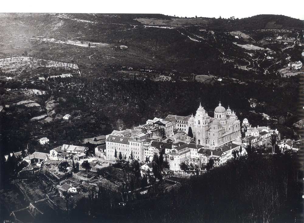 Αποψη του κτηριακού συγκροτήματος της σκήτης του Αγίου Ανδρέου από νοτιοδυτικά. Φωτογραφία των πρώτων ετών του αιώνα