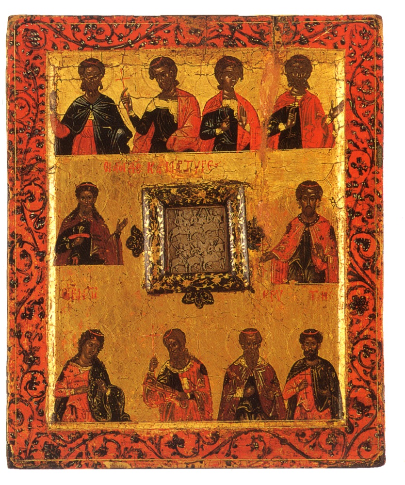 Πίσω όψη. Εξι έφιπποι στρατιωτικοί άγιοι στο μέσο και δέκα άγιοι της Κρήτης σε προτομή στο πλαίσιο. Στεατίτης (εικονίδιο) και ξύλο (πλαίσιο)