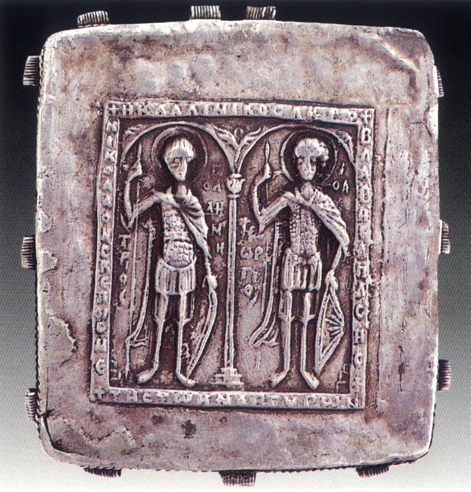 Εικονίδιο με παράσταση της Θεοτόκου Ελεούσας, 14ος αι. στην πίσω πλευρά οι Άγιοι Δημήτριος και Γεώργιος ολόσωμοι με στρατιωτική στολή και χυτό ανάγλυφο