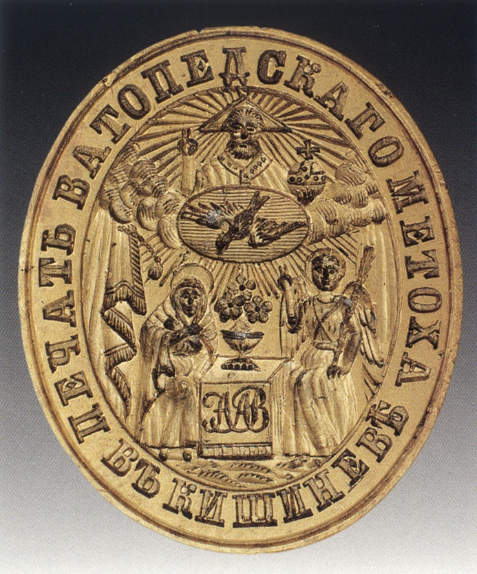 «Σφραγίδα του βατοπαιδινού μετοχίου στο Κισνόβιο», με το μονόγραμμα του επιτρόπου του μετοχίου αρχιμανδρίτου Ανθίμου Βατοπαιδινού. (1859)