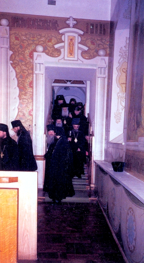 Οι επίσημοι Έλληνες Αρχιερείς εισερχόμενοι στην μεγάλη Τράπεζα της Ιεράς Μονής της Αγίας Τριάδος στο Ζαγκόρσκ.