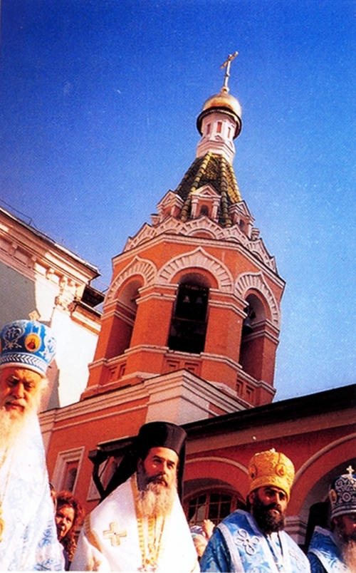 Προ της μεγάλης εκκλησίας της Παναγίας του Καζάν Έλληνες και Ρώσσοι Μητροπολίτες αναμένοντες τον Πατριάρχη της Ρωσσίας κ.κ. Αλέξιο. Εξ αριστερών ο Αργολίδος Ιάκωβος, ο Άρτης Ιγνάτιος και οι Ρώσσοι Αρχιερείς.