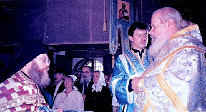 Ο Καθηγούμενος της Ιεράς Μονής Βατοπαιδίου κ. Εφραίμ αντιπροσφέρει με τη σειρά ρτου δώρα στον Πατριάρχη της Ρωσσίας κ.κ. Αλέξιο. Στο κέντρο της φωτογραφίας διακρίνεται ο Ρώσσος αρχαιολόγος και ιστορικός κ. S. Beljaev.