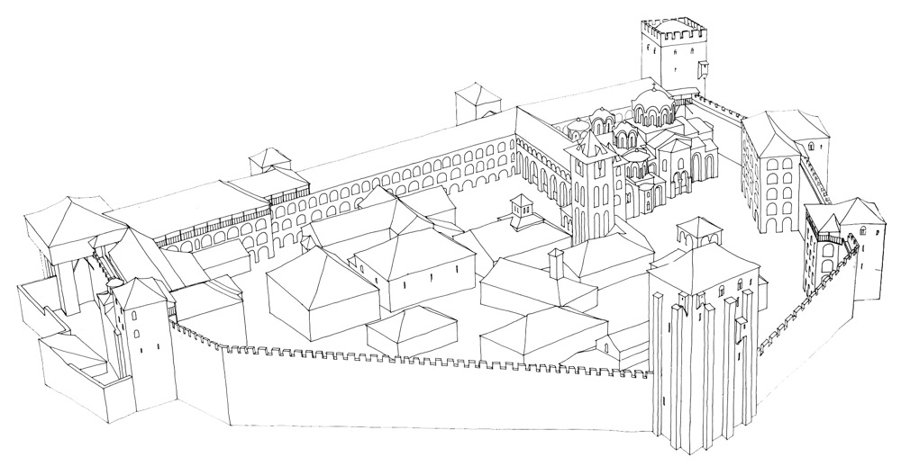 Σχηματική αναπαράσταση της Μονής στα μέσα του 18ου αιώνα, με βάση τις χαλκογραφίες και τις άλλες παλιές παραστάσεις και πηγές. Αποψη από νοτιοδυτικά. Οι μή υφιστάμενοι σήμερα κτηριακοί όγκοι αποδίδονται άλλοι συμβατικά και άλλοι υποθετικά