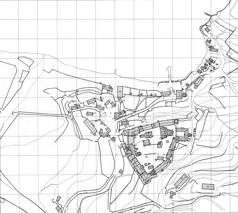Τοπογραφικό της Μονής Βατοπαιδίου και των βοηθητικών κτηρίων που την περιβάλλουν. Υπόμνημα· Α. Ανω πλατεία στην είσοδο της Μονής, Α1. Δρόμος προς Καρυές, Α2. Δρόμος προς σκήτη Αγ. Δημητρίου, Α3. Καλντερίμι προς Καρυές. Β. Κάτω πλατεία, Β1 και Β2. Δρόμοι προς τις αποβάθρες, Β3. Δρόμος προς Χατζαβάβρα. Γ1 και Δ1. Αποβάθρες. 1. Αστυνομία, 2,3 5-10. Ιδιωτικοί αρσανάδες – ψαρόσπιτα,4,12. Εργατόσπιτα, 11. Ξηραντήριο-ξυλουργείο, 13. Μέγας αρσανάς, 14. Κρήνη, 15. Σιταποθήκη, 16-19. Κηπόσπιτα, 20. Ερειπωμένη χαρταποθήκη, 21. Ελαιοτριβείο, 22,28,31. Εργατόσπιτα, 23,25. Αλευρόμυλοι, 24. Γανωτήριο, 26. Κηπόσπιτο, 27. Σιδηρουργείο, 29. Αποθήκη, 30. Αποχωρητήρια, 32. Χορταποθήκη, 33. Κάθισμα Αγ. Τρύφωνος, 34. Κοιμητηριακός ναός Αγ. Αποστόλων, 35. Βορδοναρείο, 36. Βοηθητικοί αποθηκευτικοί χώροι, 37. Ηλεκτρικός σταθμός, 38. Κάθισμα Αγ. Μοδέστου, 39. Κιόσκι, 40. Φρεατοστεγάσμα, 41. Ερειπωμένο κάθισμα Αγ. Αρτεμίου, 42. Πατητήρι-ρακαριό, 43. Μεγάλη δεξαμενή.